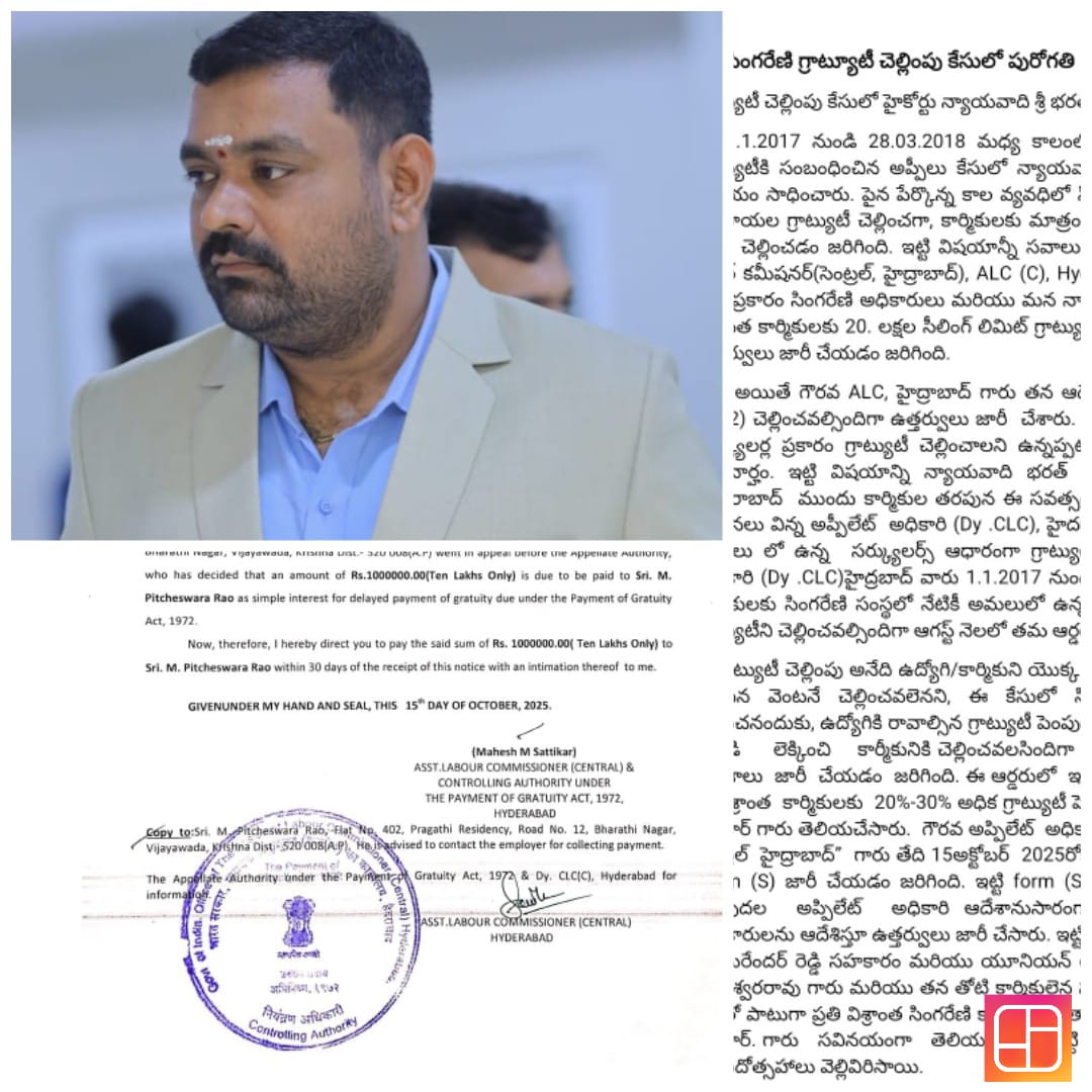 సాక్షి డివిజన్ న్యూస్, అక్టోబర్ 29 మణుగూరు/ భద్రాద్రి కొత్తగూడెం జిల్లా, రిపోర్టర్ కొర్లపాటి రాజేష్ ఖన్న: రిటైర్డ్ అయిన సింగరేణి కార్మికుల తరపున గ్రాట్యుటీకి సంబంధించిన అప్పీలు కేసులో న్యాయవాది భరత్ కుమార్ తన వాదనలను వినిపించి విజయం సాధించారు. పైన పేర్కొన్న కాల వ్యవధిలో సింగరేణి అధికారులకు సింగరేణి సంస్థ 20 లక్షల రూపాయల గ్రాట్యుటీ చెల్లించగా, కార్మికులకు మాత్రం 10 లక్షల రూపాయల సీలింగ్ గ్రాట్యుటీ మాత్రమే సింగరేణి సంస్థ చెల్లించడం జరిగింది. ఇట్టి విషయాన్నీ సవాలు చేస్తూ గత సంవత్సరం జులై నెలలో అసిస్టెంట్ లేబర్ కమీషనర్ (సెంట్రల్, హైద్రాబాద్), ఏ ఏ యల్ సి(సి) దృష్టికి తీసుకుకెళ్ళడం జరిగింది. చట్ట ప్రకారం సింగరేణి అధికారులు మరియు మన న్యాయవాది వాదనలు విన్న కమీషనరు, సింగరేణి విశ్రాంత కార్మికులకు 20 లక్షల రూపాయల సీలింగ్ లిమిట్ గ్రాట్యుటీ చెల్లించ వల్సిందిగా ఈ సంవత్సరం జనవరిలో ఉత్తర్వులు జారీ చేయడం జరిగింది.అయితే ఏ యల్ సి హైద్రాబాద్ తన ఆదేశాలలో గ్రాట్యుటీ చట్ట ప్రకారం (గ్రాట్యుటీ యాక్ట్ 1972) చెల్లించవల్సిందిగా ఉత్తర్వులు జారీ చేశారు. వాస్తవానికి సింగరేణి సంస్థలో అనాదిగా వస్తున్న సర్క్యులర్ల ప్రకారం గ్రాట్యుటీ చెల్లించాలని ఉన్నప్పటికీ, ఎటువంటి ఆదేశాలు జారీ చేయకపోవడం గమనార్హం. ఇట్టి విషయాన్ని న్యాయవాది భరత్ కుమార్ అప్పిలేట్ అధికారి (డి వై. సి యల్ సి) హైదరాబాద్ ముందు కార్మికుల తరపున ఈ సవత్సరం మార్చ్ నెలలో అప్పీలు చేయడం జరిగింది. వాదనలు విన్న అప్పీలేట్ అధికారి (డి వై.సి యల్ సి), హైదరాబాద్ గ్రాట్యుటీ పెంపుదలపై సింగరేణిలో నేటికీ అమలులో ఉన్న సర్క్యులర్స్ ఆధారంగా గ్రాట్యుటీ చెల్లించవల్సిందిగా నిర్ణయించారు. అప్పీలేట్ అధికారి (Dy .CLC)హైద్రబాద్ 1.1.2017 నుండి 28.03.2018. మధ్య కాలంలో రిటైర్ అయిన కార్మికులకు సింగరేణి సంస్థలో నేటికీ అమలులో ఉన్న సర్క్యులర్స్ ఆధారంగా పెంపుదలతో కూడిన గ్రాట్యుటీని చెల్లించవల్సిందిగా ఆగస్ట్ నెలలో తమ ఆర్డరులో ఉత్తర్వులు జారీ చేసారు. గ్రాట్యుటీ చెల్లింపు అనేది ఉద్యోగి/కార్మికుని యొక్క హాక్కు అని, ఆ గ్రాట్యుటీ చెల్లింపు ఉద్యోగి రిటైర్ అయిన వెంటనే చెల్లించ వలెనని, ఈ కేసులో సింగరేణి సంస్థ నేటికీ కార్మికులకు గ్రాట్యుటీ చెల్లించ నందుకు, ఉద్యోగికి రావాల్సిన గ్రాట్యుటీ పెంపుదలమీద 10శాతం రిటైర్ అయిన మరుసటి రోజు నుండి లెక్కించి కార్మీకునికి చెల్లించ వలసిందిగా తన ఆర్డరులో అప్పిలేట్ అధికారి కూడా ఆదేశాలు జారీ చేయడం జరిగింది. ఈఆర్డరులో ఇచ్చిన ఆదేశానుసారంగా ఏ యల్ సి ఇచ్చిన ఆర్డరు పై విశ్రాంత కార్మికులకు 20%-30% అధిక గ్రాట్యుటీ పెంపుదల వర్తింపచేస్తుందని న్యాయవాది భరత్ కుమార్ తెలియచేసారు. అప్పిలేట్ అధికారి ఆదేశానుస