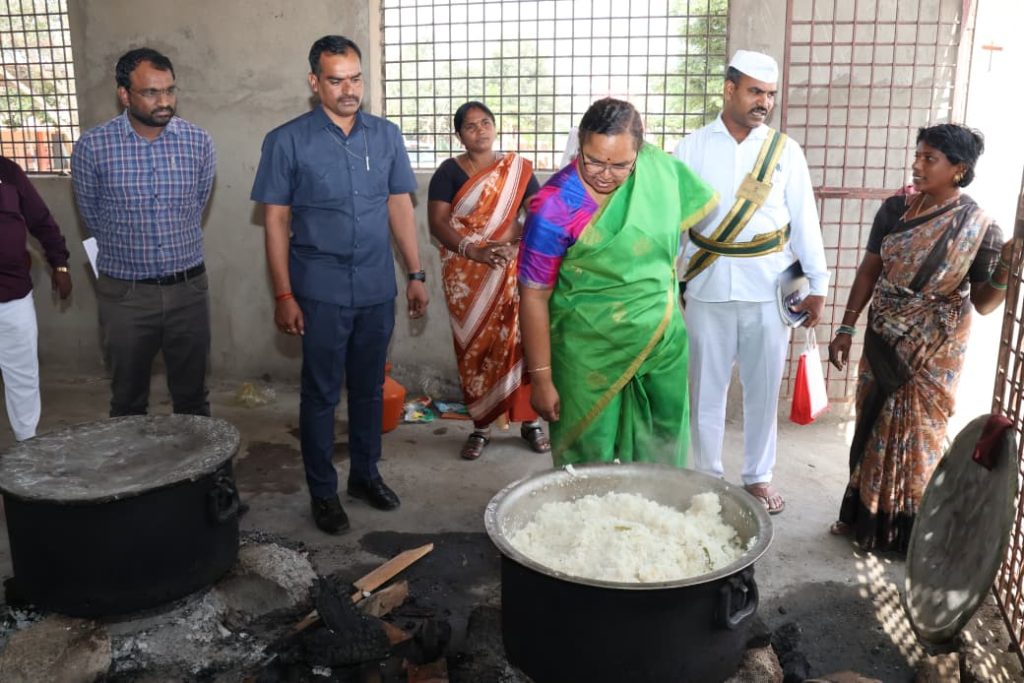 సాక్షి డిజిటల్ న్యూస్, నవంబర్ 07: కొండపాక, సిద్దిపేట జిల్లా లోని కొండపాక, కుకునూరు పల్లి మండల కేంద్రంలోని జిల్లా పరిషత్ ఉన్నత పాఠశాలలో మధ్యాహ్న భోజన ప్రక్రియను జిల్లా కలెక్టర్ కె హైమావతి క్షేత్రస్థాయిలో పరిశీలించారు. వంట గదిలో ఆహార పదార్థాలను పరిశీలించారు. మెనూ ప్రకారమే ఆలుగడ్డ టమాటా పప్పు, బిర్యాని రైస్ వండినట్లుగా వంట సిబ్బంది కలెక్టర్ కి తెలిపారు. ఆహార పదార్థాల నాణ్యత పరిశీలిస్తూ బిర్యాని మరియు కూరల్లో నాణ్యత పెంచాలని విద్యార్థులకు రుచికరంగా వండాలని వంట సిబ్బందిని ఆదేశించారు. పాఠశాలలో పిల్లల హాజరు బియ్యం వంట సరుకులు అందించాలని వంట ప్రక్రియను తనికి చెయ్యాలని ప్రిన్సిపల్ ను ఆదేశించారు. పాఠశాల లోపల వరండాలో ఉండకుండా, బయట మైదానంలో ఆకులు లో శుభ్రంగా లేదని పాఠశాల ఇంత అపరిశుభ్రంగా ఉంటే ఏం డ్యూటీ చేస్తున్నారని ప్రిన్సిపల్ స్కావెంజర్స్ పైన ఆగ్రహం వ్యక్తం చేసి యాక్షన్ తీసుకోవాలని డి ఈ ఓ ను ఫోన్ ద్వారా ఆదేశించారు.కొండపాక మండల లోని తిమ్మారెడ్డి పల్లి లో గల మండల పరిషత్ ప్రాథమిక పాఠశాల మరియు జిల్లా పరిషత్ ఉన్నత పాఠశాలను జిల్లా కలెక్టర్ ఆకస్మిక సందర్శించి మధ్యాహ్న భోజన ప్రక్రియను క్షేత్రస్థాయిలో పరిశీలించారు. వంట గదిలో బిర్యానీ, ఆలుగడ్డ టమాటా కూర చేసినట్లుగా వంట సిబ్బంది కలెక్టర్ కి తెలిపారు. పాఠశాలలో పిల్లల హాజరు బియ్యం వంట సరుకులు అందించాలని వంట ప్రక్రియను తనికి చెయ్యాలని ప్రిన్సిపల్ ను ఆదేశించారు. విద్యార్థులకు భోజనం, చదువు విషయంలో ఎలాంటి లోటు కలగకుండా చూసుకోవాలి. విద్యార్థులతో భోజన ప్రక్రియను పరిశీలిస్తూ అన్నo, కూర వదలకుండా తినాలని అన్నం పరబ్రహ్మ స్వరూపం అని సూచించారు. ఈ వయసులో బాగా తినాలని శారీరకంగా దృఢంగా ఉంటేనే మానసిక ఆరోగ్యం గా ఉంటారని తెలిపారు.అనంతరం ప్రాంగణంలోని అంగన్వాడీ కేంద్రాన్ని సందర్శించి పిల్లలకు పౌష్టికాహారం అందించాలని బాలింతలకు, పిల్లలకు అందించాల్సిన భోజనం, స్నాక్స్, బాలమృతం ఇతరత్ర అన్ని వసతులు కల్పించాలని సిబ్బందిని ఆదేశించారు.