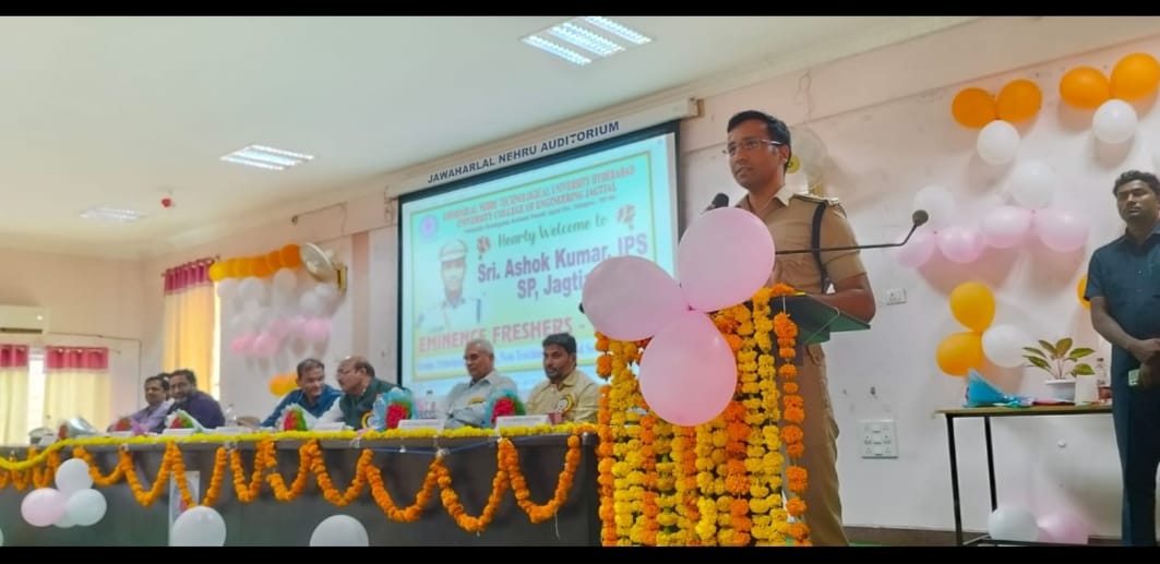 సాక్షి డిజిటల్ న్యూస్ 8నవంబర్ 2025 (జగిత్యాల్ జిల్లా ఇంచార్జ్) బోనగిరి మల్లారెడ్డి : యువతే దేశ భవిష్యత్తు చట్టాన్ని గౌరవించే పౌరులుగా ఎదగాలి కొండగట్టు జేఎన్టీయూ ఇంజనీరింగ్ కళాశాలలో ఫ్రెషర్స్ డే కార్య క్రమాన్ని ఉత్సాహంగా నిర్వహించారు. ఈ కార్యక్రమానికి జిల్లా ఎస్పి అశోక్ కుమార్, ముఖ్య అతిథిగా హాజరై విద్యార్థులను ఉత్సాహపరిచారు. ఈ సందర్భంగా ఎస్పీ విద్యార్థులను ఉద్దేశించి మాట్లాడుతూ విద్య అనేది కేవలం ఉద్యోగం పొందడానికి మాత్రమే కాదు, మంచి వ్యక్తిత్వాన్ని నిర్మించడానికి ఉపయోగపడే ఆధ్యాత్మిక శక్తి అని ప్రతి విద్యార్థి జీవితంలో క్రమశిక్షణ, కష్టపడి చదువుకోవడం, ముఖ్యమని అన్నారు. విద్యార్థులు సాంకేతిక పరిజ్ఞానంతో పాటు మానవీయ విలువలను అలవరచుకోవాలి, అని అన్నారు. యువతే దేశ భవిష్యత్తు కాబట్టి, వారు చట్టాన్ని గౌరవిస్తూ బాధ్యతాయుత పౌరులుగా ఎదగాలని పిలుపునిచ్చారు. సోషల్ మీడియాలో సమయాన్ని వృథా చేయకుండా, దానిని నేర్చుకోవడానికీ, కొత్త ఆలోచనలను అభివృద్ధి చేసుకోవడానికీ వినియోగించు కోవాలని సూచించారు. సమాజంలో జరుగుతున్న సైబర్ నేరాలపై అవగాహన కలిగి ఉండాలని, తెలియని లింకులు, ఫేక్ ఐడీలకు స్పందించకూడదని సూచించారు. కళాశాల యాజమాన్యం ఎప్పటికప్పుడు విద్యార్థుల నడవడిక, ప్రవర్తన పట్ల శ్రద్ధ వహించాలని ఎస్పీ సూచించారు. సీనియర్లు జూనియర్లు అనే తేడా లేకుండా స్నేహపూర్వక వాతావరణంలో విద్యాభ్యాసం కొనసాగించాలని, ర్యాగింగ్ వంటి చర్యలకు దూరంగా ఉండాలని, సమాజంలో ఆదర్శవంతులుగా నిలవాలని అన్నారు. అలాగే గంజాయి, డ్రగ్స్ వంటి మత్తు పదార్థాల వాడకం భవిష్యత్తును నాశనం చేస్తుందని ఈలాంటి వాటికి దూరంగా ఉండాలని సూచించారు. గంజాయి లాంటి మత్తుపదార్థాలకు సంబంధించిన సమాచారాన్ని పోలీస్ వారికి అందివ్వాలని తెలిపారు. విద్యార్థులు చేడు వ్యసనాలకు దూరంగా ఉంటూ తల్లిదండ్రుల నమ్మకాన్ని నిలబెట్టుకుని, కష్టపడి చదివి ఉన్నతస్థాయికి ఎదగాలని సూచించారు.