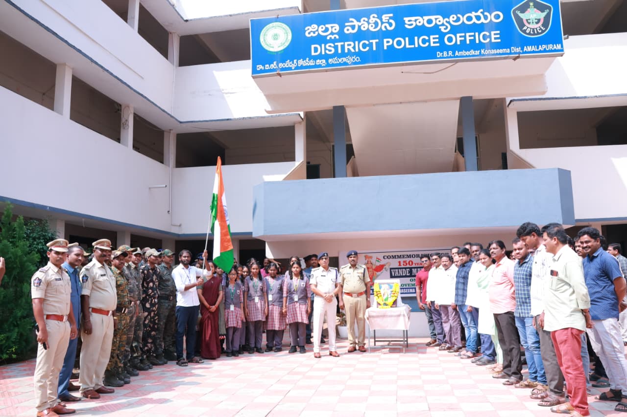 సాక్షి డిజిటల్ న్యూస్ నవంబర్ 7, డాక్టర్ బి.ఆర్ అంబేద్కర్ కోనసీమ జిల్లా ప్రతినిధి జి శ్రీనివాసరావు: అమలాపురం జిల్లా పోలీస్ కార్యాలయంలో జిల్లా ఎస్పీ రాహుల్ మీనా ఐ.పి.ఎస్ ఆదేశాల మేరకు శుక్రవారం రోజున ప్రత్యేక కార్యక్రమాన్ని ఘనంగా నిర్వహించారు. ఈ వేడుకలో అదనపు ఎస్పీ ఏ.వి.ఆర్.పి.బి. ప్రసాద్ ముఖ్య అతిథిగా పాల్గొన్నారు. జాతీయ భావాన్ని ప్రతిబింబిస్తూ కార్యాలయం ఆవరణలో ఉన్న భారతమాత చిత్రపటానికి అదనపు ఎస్పీ పూలమాల వేసి నివాళులర్పించారు. అనంతరం, అదనపు ఎస్పీ ఏ.వి.ఆర్.పి.బి. ప్రసాద్ , పోలీస్ కార్యాలయంలోని అధికారులు, సిబ్బందితో కలిసి సామూహికంగా వందేమాతర గేయాన్ని భక్తిశ్రద్ధలతో ఆలపించారు. ఈ సందర్భంగా అదనపు ఎస్పీ మాట్లాడుతూ, స్వాతంత్ర్య పోరాటంలో అశేష ప్రజానీకానికి వందేమాతరం గేయం గొప్ప స్ఫూర్తిని, ప్రేరణను ఇచ్చిందని, దీనిని రచించిన బంకిం చంద్ర చటర్జీని స్మరించుకోవాల్సిన బాధ్యత మనందరిపై ఉందని తెలిపారు. ఈ గేయం దేశభక్తిని, జాతీయ ఐక్యతను పెంపొందించడంలో కీలక పాత్ర పోషించిందని పేర్కొన్నారు. ఈ కార్యక్రమంలో జిల్లా ఏ ఆర్ డి ఎస్ పి శ్రీ సుబ్బరాజు , ఎస్ బి సీఐ పుల్లారావు , డి సి ఆర్ బి సీఐ మురళి కృష్ణ , ఏ ఆర్ ఆర్ ఐ లు బ్రహ్మానందo కోటేశ్వరరావు మరియు కార్యాలయ సిబ్బంది, ఇతర అధికారులు పాల్గొన్నారు.