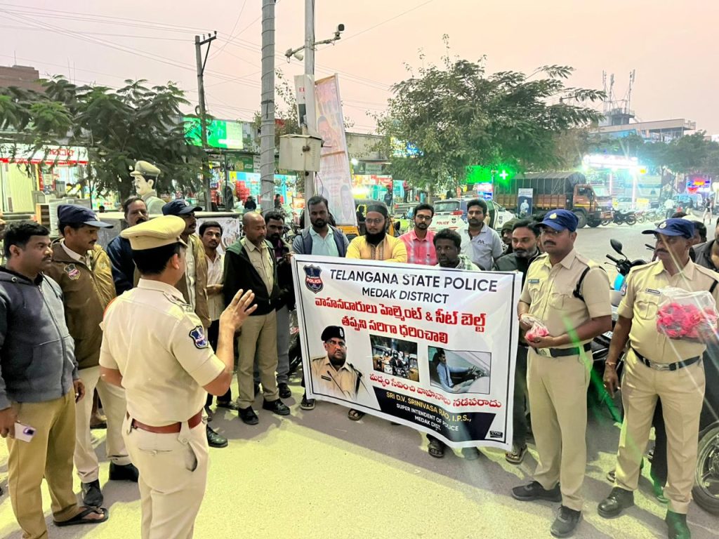 సాక్షి డిజిటల్ న్యూస్ మెదక్ జిల్లా తూప్రాన్ జనవరి 02 ప్రతినిధి మెదక్ జిల్లా తూప్రాన్ పట్టణంలోని నర్సాపూర్ చౌరస్తా వద్ద పోలీసులు జనవరి 1 నుంచి 31 వరకు రాష్ట్ర ప్రభుత్వం ప్రజలకు రోడ్డు భద్రత గురించి అవగాహన సదస్సు నిర్వహిస్తున్నారు అందులో భాగంగా శుక్రవారం సాయంత్రం నర్సాపూర్ చౌరస్తా వద్ద వాహనదారులకు హెల్మెట్ ధరించాలని సూచించారు హెల్మెట్ ధరించిన వారికి శాలువతో సన్మానిం చారు లేని వారికి గులాబీ పువ్వులు చెవిలో పెట్టి ఇంకోసారి హెల్మెట్ లేకుండా రావద్దని కోరారు ప్రతి మనిషికి ఆరోగ్యంగా ఎంత సురక్షితమో వాన దారులకు రోడ్డుమీద వెళ్లేటప్పుడు హెల్మెట్ సీట్ బెల్టు ధరించడం అంతే ముఖ్యం అందుకనే ప్రతి ఒక్కరు హెల్మెట్ ధరించాలని తమ ప్రాణాలు ఎవరి వారి రక్షణగా నిలబడాలని ప్రజలకు కోరారు ఈ కార్యక్రమంలో ఎస్సై టు జ్యోతి ఏ ఎస్ ఐ వాణి పోలీస్ సిబ్బంది కానిస్టేబుల్ తదితరులు పాల్గొన్నారు
