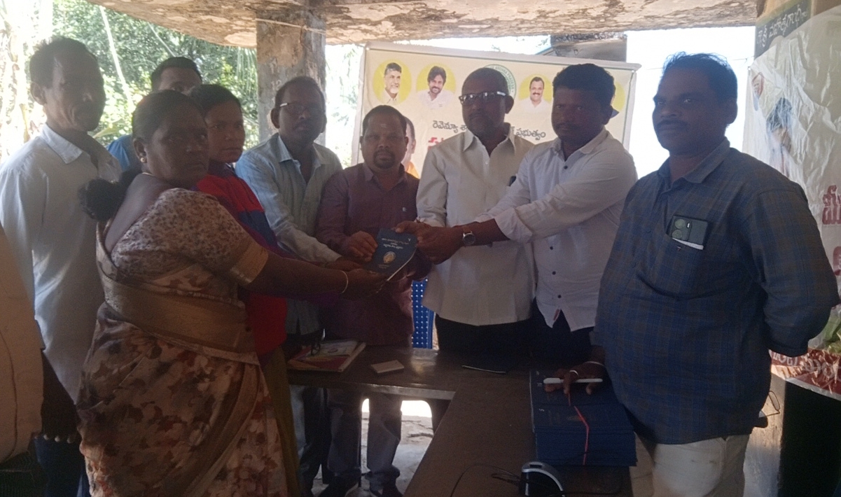 సాక్షి డిజిటల్ న్యూస్, జనవరి 9 రాష్ట్ర ప్రభుత్వం ప్రవేశపెట్టిన పాట్టాదారు పాస్ బుక్స్ పంపిణీ కార్యక్రమం రోలుగుంట మండలం శివారు మోకాస కొత్తపట్నం పంచాయతి పెదపెటలో గురువారం రెవిన్యూ సిబ్బంది రీ సర్వే డి టి కె చిన్నయ్య పడల్ వీర్వో రాజులమ్మ టీడీపీ సీనియర్ నాయకుడు మడ్డు పైడి తల్లి నాయుడు వైసీపీ జిల్లా ఎస్టీ సెల్ అధ్యక్షులు బి సతీష్ చేతులు మీదుగా పంపిణీ చేశారు.ఈ సందర్బంగా అయన మాట్లాడుతూ గత ప్రభుత్వంలో జరిగిన రీ సర్వే ప్రకారం మోకాస కొత్తపట్నం పెదపెట రెవిన్యూలో సుమారు 129 పట్టాదారు పాస్ బుక్స్ వచ్చాయని తెలిపారు. ఇందులో అర్హులైన 120 మందికి లబ్ధిదారులకు పంపిణీ చేశామని అన్నారు.మిగితా 9 మందికి త్వరలో పట్టాదారు పాస్ బుక్స్ అందజేస్తామని వివరించారు.ఈ కార్యక్రమంలో కూటమి నాయకులు మడ్డు పైడి తల్లి నాయుడు,ఎం కె పట్నం బూత్ నెం 2 బూత్ కన్వీనర్ పాగి పోతునాయుడు,స్థానిక సర్పంచ్ బర్సింగి నూకాలమ్మ తనయుడు వైసీపీ జిల్లా ఎస్టీ సెల్ అధ్యక్షులు బర్సింగి సతీష్,స్థానిక టీడీపీ నాయకులు పాగి నరసింహమూర్తి,కొదమ నారాయణ,గ్రామ ప్రజలు తదితరులు పాల్గొన్నారు.