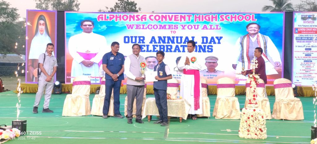 సాక్షి డిజిటల్ న్యూస్, జనవరి 25, రామకృష్ణాపూర్: విద్యార్థులు తమ పాఠశాల స్థాయి నుండే వినయ విధేయతలు కలిగి ఉండాలని, విజ్ఞత తో కూడిన విద్యను అవలంబిస్తూ పాఠశాలకు, తల్లితండ్రులకు మంచి పేరు తీసుకురావాలని కార్మిక ఉపాధి శాఖ మంత్రి గడ్డం వివేక్ వెంకటస్వామి అన్నారు. శనివారం రామకృష్ణాపూర్ పట్టణంలోని బిఎల్ అల్ఫో న్సా పాఠశాల వార్షికోత్సవ కార్యక్రమానికి ముఖ్య అతిథులుగా మంత్రి గడ్డం వివేక్ వెంకటస్వామి హాజరయ్యారు.ముఖ్య అతిథులుగా జోషప్ తచాపరంభాత్, బినోయ్ మ్యాథ్యూ , ఎంఈఓ రమేష్ రాథోడ్, సిస్టర్ నోబుల్ లు హాజరవ్వగా పాఠశాల హెడ్ మిస్ట్రెస్ బ్లేస్సి సాధారణంగా ఆహ్వానించారు. ఈ సందర్భంగా వివేక్ మాట్లాడారు. ఆల్ఫోన్స లాంటి పాఠశాల రామకృష్ణాపూర్ పట్టణంలో ఉండడం ఈ ప్రాంత ప్రజలకు ఒక వరం అని అన్నారు. విద్యార్థులు చిన్నతనం నుండే జీవిత లక్ష్యాలను ఏర్పరచుకొని వాటిని సాధించే దిశలో కష్టపడాలని సూచించారు.ఉపాధ్యాయులు విద్యార్థులను మందలించి నపుడు తల్లిదండ్రులు విజ్ఞతతో మెలగాలని తెలిపారు. పాఠశాలలో ఉత్తమ ప్రతిభ కనబరిచిన విద్యార్థులకు మెమొంటోలు అందజేశారు. వార్షికోత్సవ కార్యక్రమంలో విద్యార్థులు కనబర్చిన సాంస్కృతిక కార్యక్రమాలు పాఠశాలకు వచ్చిన తల్లిదండ్రులను అబ్బురపరచాయి. పాఠశాలలో ప్రతీ రోజూ,ప్రతీ కార్యక్రమంలో నిర్వహించే అంశాలను వీడియో ఆల్బమ్ రూపంలో చక్కగా చూపించారు. ఈ కార్యక్రమంలో పాఠశాల విద్యార్థులు తల్లిదండ్రులు ముఖ్య అతిథులు పెద్ద ఎత్తున పాల్గొన్నారు.
