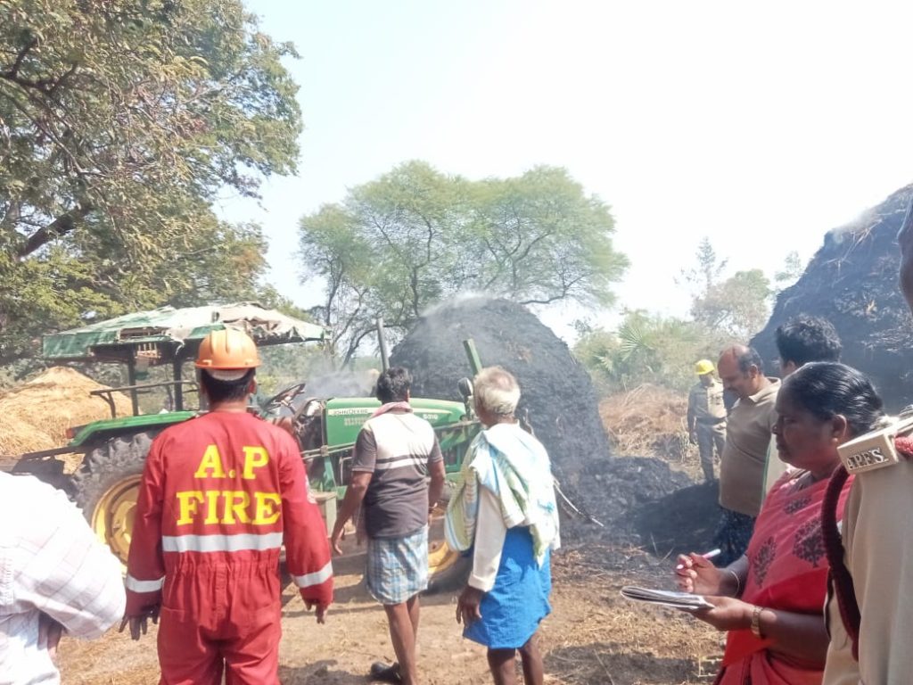 సాక్షి డిజిటల్ న్యూస్, జనవరి 24, మండలంలో మొఖాస కొత్తపట్నం పంచాయతీ పరిధి పోతల వారు కల్లాల వద్ద వరి కుప్పల్లో మంటలు చెలరేగడంతో స్థానిక గ్రామస్తులు వెళ్లి మంటలు ఆర్పి ప్రయత్నం చేశారు. వెంటనే వీఆర్వో రాజులమ్మ వెళ్లి పరిశీలించి ఫైర్ స్టేషన్ కు సమాచారం అందించారు.సమాచారం అందిన వెంటనే ఫైర్ స్టేషన్ సంఘటన స్థలానికి చేరుకొని నాలుగు ట్యాంకర్లతో మంటలు ఆర్పేశారు.స్థానికుల ఇచ్చిన సమాచారం ప్రకారం రోలుగుంట మండలం మోకాస కొత్తపట్నం గ్రామానికి చెందిన పోతల వెంకటస్వామి నాయుడు(చిన్న) గొలుగొండ మండలం కోదురుపాలెం గ్రామానికి చెందిన పొన్నాడ తాతిబాబు,వారి నాలుగు వరి కుప్పలు గుర్తు తెలియని వ్యక్తులు నిప్పు అంటించిరాణి రైతులు తెలిపారు.సుమారు 160 వరి బస్తాలు వస్తాయని అన్నారు.రూ.1 లక్షల ఆస్తి నష్టం వచ్చిందని రైతులు ఆవేదన వ్యక్తం చేస్తున్నారు.మాకు ప్రభుత్వం ఆదుకోవాలని కోరారు.