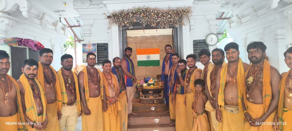 సాక్షి డిజిటల్ జనవరి 26 వనపర్తి జిల్లా పెబ్బేరు: మండల పరిధిలోని కంచిరావుపల్లి గ్రామంలో శ్రీశ్రీశ్రీ చెన్నకేశ్వర స్వామి దేవాలయంలో సోమవారం నాగరాజు గౌడ్ గురుస్వామి ఆధ్వర్యంలో గంధం, భస్మం, అరటి ఆకులతో జాతీయ జెండా అలంకరణతో అద్భుతంగా శివ స్వాముల సౌజన్యంతో ఉదయాన్నే అభిషేకాలతో శివలింగానికి ప్రత్యేక పూజలు నిర్వహించి పూజా కార్యక్రమాలు అనంతరం త్రివర్ణ పతాకం జెండా రంగులను అలంకరించారు. శివ దీక్షలు లో భాగంగా జనవరి 26 గణతంత్ర దినోత్సవం పురస్కరించు కొని కంచిరావుపల్లి గ్రామానికి చెందిన శివ స్వాములందరి సౌజన్యంతో జాతీయ త్రివర్ణ పతాకం అలంకరణ చేసినట్లు నాగరాజు గౌడ్ గురుస్వామి తెలియజేశారు. ఈ కార్యక్రమంలో బాల గౌడ్ స్వామి, భరత్ గౌడ్ స్వామి, శేఖర్ స్వామి, శివ స్వాములు ,గురు స్వాములు పాల్గొన్నారు.