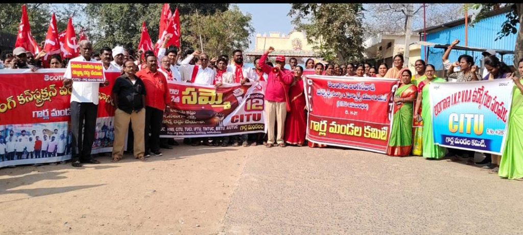 సాక్షి డిజిటల్ న్యూస్ ఫిబ్రవరి 13 మహబూబాబాద్ జిల్లా గార్ల మండలం (రిపోర్టర్ వల్లపుదాసు వెంకటేశ్వర్లు) సార్వత్రిక సమ్మెతో కేంద్ర ప్రభుత్వ తీరు పై సంఘటితంగా పోరాటం చేయాలని, అన్ని వర్గాల కార్మిక సంఘాలు, రాజకీయ పార్టీలు కేంద్ర ప్రభుత్వం అమలు చేస్తున్న దుర్మార్గపు చట్టాలకు వ్యతిరేకంగా ఉద్యమంలోకి రావాలని సిపిఎం రాష్ట్ర కమిటీ సభ్యులు పి. సోమయ్య పిలుపునిచ్చారు. కేంద్ర ప్రభుత్వం అనుసరిస్తున్న రైతు, కార్మిక, ప్రజా ప్రజావ్యతిరేక విధానాలను నిరసిస్తూ కార్మిక సంఘాలు తలపెట్టిన దేశవ్యాప్త సార్వత్రిక సమ్మెలో భాగంగా గురువారం గార్ల మండల కేంద్రంలో కార్మిక సంఘాలు,రాజకీయ పార్టీలు, యువజన, విద్యార్థి సంఘాల ఆధ్వర్యంలో భారీ ప్రదర్శన నిర్వహించారు. ఈ సమ్మెను ఉద్దేశించి సిపిఎం రాష్ట్ర కమిటీ సభ్యులు పి. సోమయ్య మాట్లాడుతూ కేంద్ర ప్రభుత్వం అక్రమంగా తీసుకువచ్చిన లేబర్ కోడ్లను రద్దు చేయాలని, 44 కార్మిక చట్టాలు అమలు చేయాలని, నూతన విత్తన చట్టాన్ని నూతన విద్యుత్ సవరణ చట్టాన్ని రద్దు చేయాలని, వి బి జి రామ్ జి ఉపాధి హామీ పథకాన్ని రద్దుచేసి మహాత్మా గాంధీ జాతీయ గ్రామీణ ఉపాధి పథకాన్ని కొనసాగించాలని, ప్రభుత్వ రంగ సంస్థల ప్రైవేటీకరణ ఆపాలని డిమాండ్ చేశారు. ఈ సమ్మె లో వామపక్ష పార్టీ ల నాయకులు, కార్మిక సంఘాల నాయకులు కందునూరి శ్రీనివాస్, కట్టెబోయిన శ్రీనివాస్,జడ సత్యనారాయణ, అలవాల సత్యవతి, గంగావత్ లక్ష్మణ్ నాయక్,శీలం శెట్టి రమేష్ లు మోడీ ప్రభుత్వ విధానాలను ఎండగట్టారు.ప్రభుత్వ రంగ పరిశ్రమలను కాపాడటం, కనీస వేతనాల పెంపు కోసం పోరాటం అత్యవసరమని, మనువాద, బ్రాహ్మణీయ, కార్పొరేట్ విధానాలకు వ్యతిరేకంగా జరిగిన దేశ వ్యాప్త సార్వత్రిక సమ్మెలో పాల్గొన్న కార్మికులు, కార్మిక సంఘాల నాయకులు, రైతు లు, రాజకీయ పార్టీ ల నాయకులు, ప్రజల కు వారు ధన్యవాదాలు తెలిపారు. కాగా ఈ సమ్మెకు పట్టణంలోని వ్యాపారస్తులు, వాణిజ్య, విద్యాసంస్థలు,వ్యాపార సముదాయాలు స్వచ్ఛందంగా బంద్ పాటించి సమ్మెకు మద్దతు తెలిపారు. మండల కేంద్రంలోని సీఐటీయూ కార్యాలయం నుండి ప్రారంభమైన సమ్మె నెహ్రు సెంటర్, డోర్నకల్ రోడ్డు, బాలికల పాఠశాల,ఎస్ బి ఐ ఎటిఎం సెంటర్,మెయిన్ రోడ్డు,బయ్యారo రోడ్ మీదుగా సాగింది. ఈ సమ్మె లో సీఐటీయూ, ఏఐటీయూసీ, ఐఎఫ్ టీ యూ కార్మిక సంఘాల నాయకులు, బి. అప్పిరెడ్డి, ఎ. వీరాస్వామి, జె. వెంకన్న, జి. సక్రు,జె. విశ్వ,సీఐటీయూ అనుబంధ సంఘాల నాయకులు, సిపిఎం నాయకులు జి.రాజారావు, వి. వెంకటేశ్వర్లు, యం. నాగమణి,కె ఈశ్వర్ లింగం,ఐ. గోవింద్, సి హెచ్.ఎల్లయ్య, కై బాబు, సత్యం, టీ. రమా, మౌనిక, అంగన్వాడీలు నీలాదేవి, టీ. పద్మ, కె.వసంత, విక్టోరియా, కృష్ణకుమారి,ఆశా వర్కర్ లు రమాదేవి, ఉమాదేవి, ఆశకుమారి, సుజాత, వివో ఎల్ లు అనిత, రమా,చ